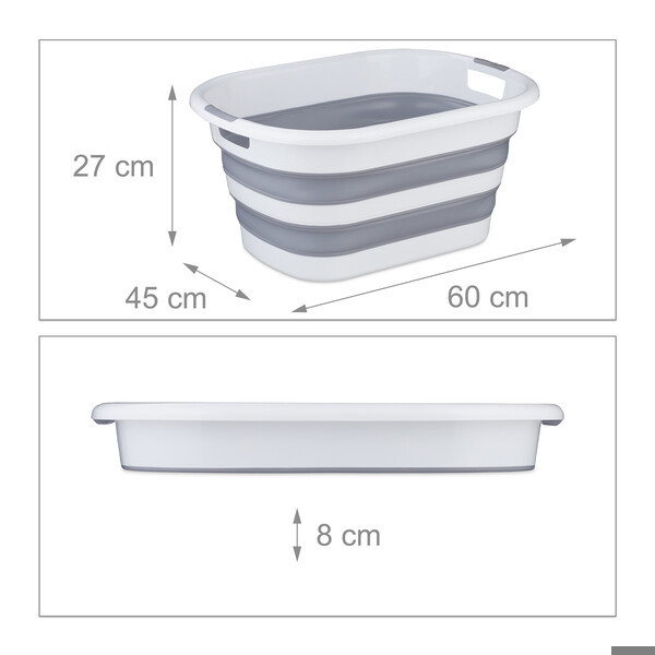 Der Wäschekorb hat die Gesamtmaße von ca. 27 x 60 x 45 cm (H x B x T) und eine Höhe von ca. 8 cm im zusammengefalteten Zustand.